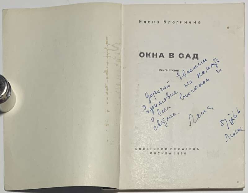 На титульном листе дарственная надпись — автограф автора: `Дорогой Евгении Ефимовне на память о всем высоком и светлом. Лена 5/IX 66 Москва`.