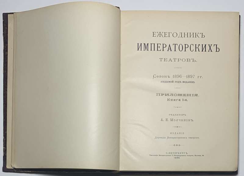 Ежегодник Императорских театров. 7 год издания. Сезон 1896–1897 гг. Приложения. Книга 1-2-3. Редактор А.Е. Молчанов. СПб.: издание Дирекции Императорских театров, тип. Императорских С.-Петербургских театров, 1898. 1: [3], 129, [1] с.: ил., 1 л. портр.; 2: [3], 134, [1] с.: ил., 2 л. портр.; 3: [3], 144, [1] с.: ил., 1 л. портр.