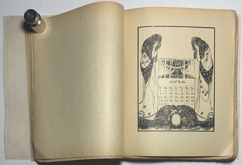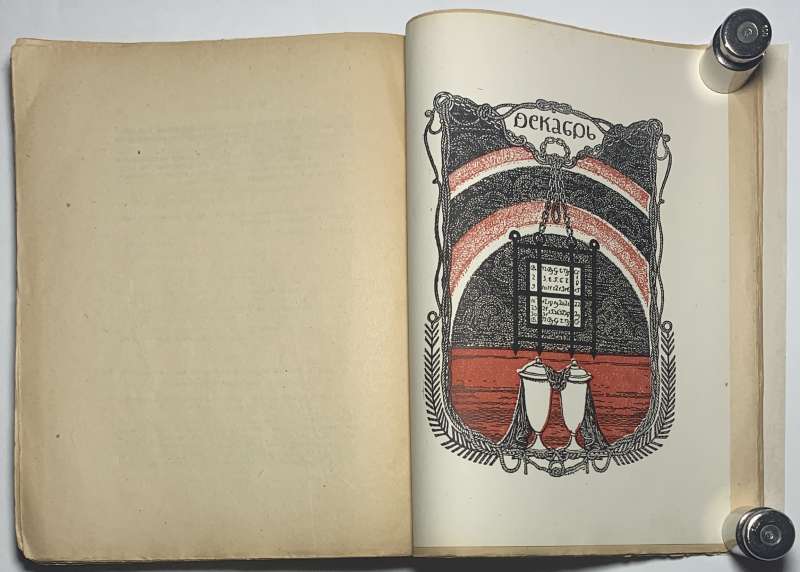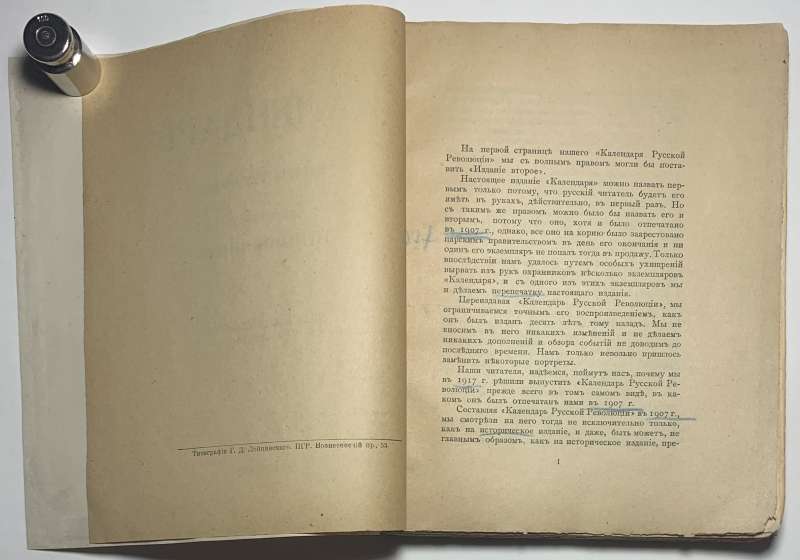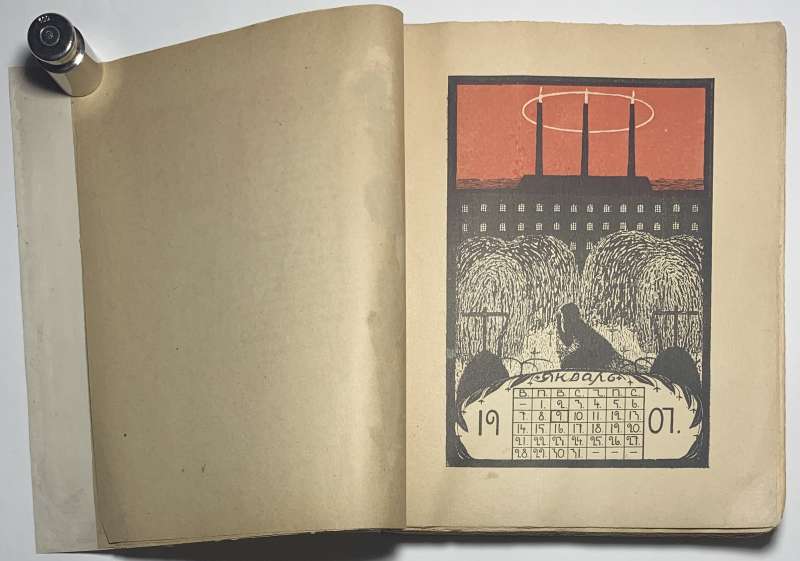 Впервые «Календарь Русской Революции» отпечатан в 1907 г. 12 цветных иллюстраций выполнены художниками: С. Чехониным, Е. Лансере, Б. Кустодиевым, М. Добужинским, З. Гржебиным, И. Билибиным, Б. Анисфельдом. Из аннотации: «Издание было арестовано царским правительством в день его окончания и ни один из экземпляров не попал тогда в продажу. Только впоследствии нам удалось путем хитрых ухищрений вырвать из рук охранников несколько экз., и с одного из этих экз. мы и делаем перепечатку настоящего издания…. Настоящее изд. календаря заключает в себя обзор революционных и общественных движений до 1905–06 гг.».