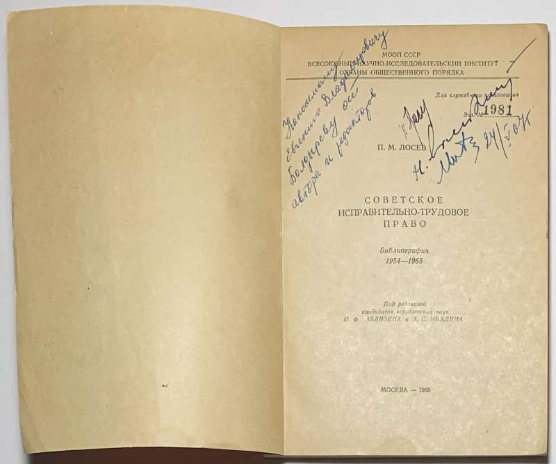 Лосев П.М. [Автографы] Советское исправительно-трудовое право. Библиография 1954-1965.