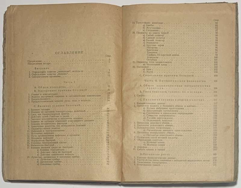 Расположением материала в книге автор хотел создать представление о связи отдельных процессов друг с другом, о возможных переходах одного в другой. Так, за расстройствами обмена веществ следуют атрофия и смерть клеток, как следствия первых; за гистопатологией идут расстройства кровообращения, как процессы системного характера. Иммунитет и анафилаксия отделены от главы о паразитах, так как эти сложные явления удобнее изучать после прохождения всего курса патологической физиологии. Наконец, в классификации патологических процессов автор не придерживался деления их на регрессивные и прогрессивные, так как такое деление вносит ряд недоразумений при объективной оценке патологических процессов.