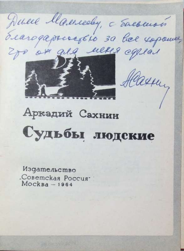 На титульном листе дарственная надпись: `Диме Мамлееву, с большой благодарностью за все хорошее, что он для меня сделал А. Сахнин`