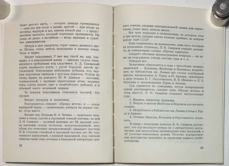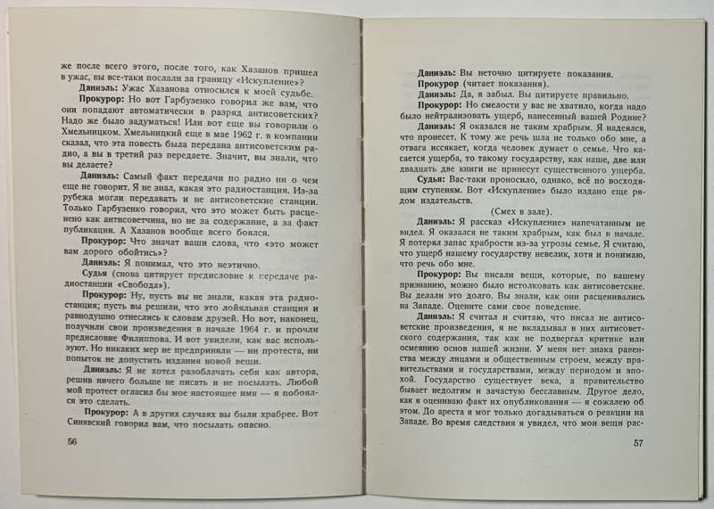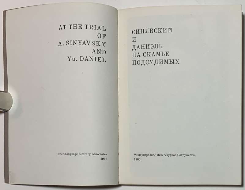 Самая первая книга-свидетельство, вышедшая о деле Синявского и Даниэля на Западе. Процесс против писателей Ю.М. Даниэля (1925-1988) и А.Д. Синявского (1925-1997) получил огромный резонанс во всём мире. Они были арестованы осенью 1965 года, судебные заседания проходили 10—14 февраля 1966 года в Мособлсуде. Процесс вёлся председателем Верховного суда РСФСР Львом Смирновым. Обвинительный приговор вызвал международный скандал и протесты внутри страны, положившие начало диссидентского движения в СССР.